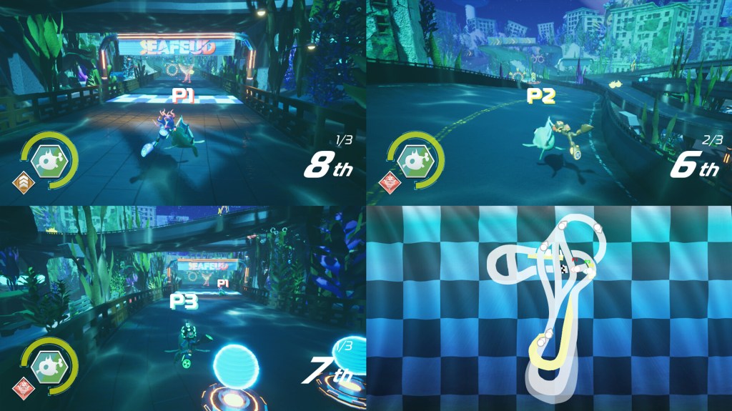 SeaFeud is a 3D underwater arcade racing game. Players race on fish and dynamically change their “vehicle” stats by colliding and swapping with other fish on the course. While in typical racing games, players select their vehicle or customize their vehicle prior to starting the game, SeaFeud switches things up by defaulting everyone to a basic fish at the beginning of the race. Throughout the race, the player can swap to other fish, giving them a statistical edge. While on these fish, their stamina will run down before swapping back, encouraging the player to try different playstyles.